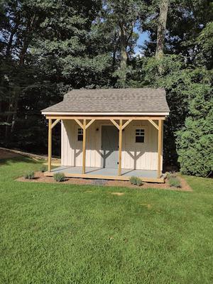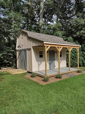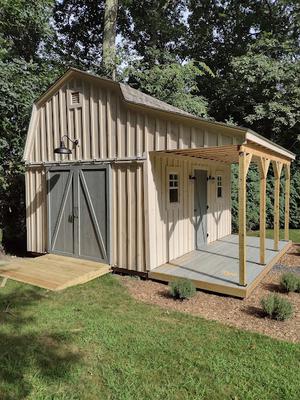 I built the 12x16 barn porch shed over the course of 4 months. The plans and building guide did a great job of laying out the process. I used board and batten siding (2 inch battens ripped from 1x12 boards), sliding doors and added windows. The porch is done using Trex decking with 5/4 border on the front and sides. The cupola is under construction! Thank you Shed King for the clear and reasonably priced plans. A rewarding and fun experience.